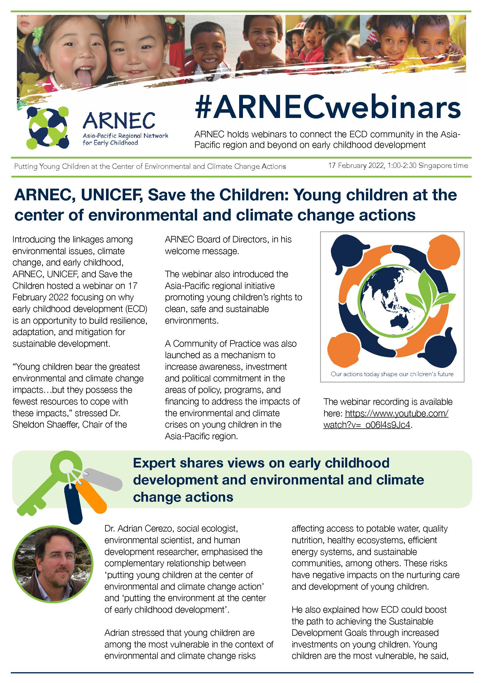 Introducing the linkages among environmental issues, climate change, and early childhood, ARNEC, UNICEF, and Save the Children hosted a webinar on 17 February 2022 focusing on why early childhood development (ECD) is an opportunity to build resilience, adaptation, and mitigation for sustainable development.